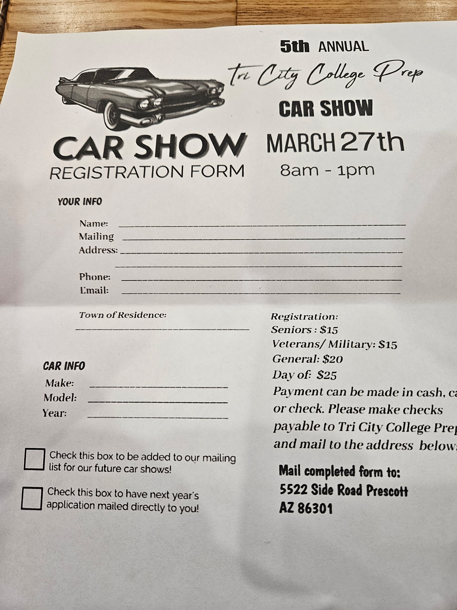 27 Prescott Valley, AZ 5th Annual Tri - City Collage Prep Car Show Event Flyer