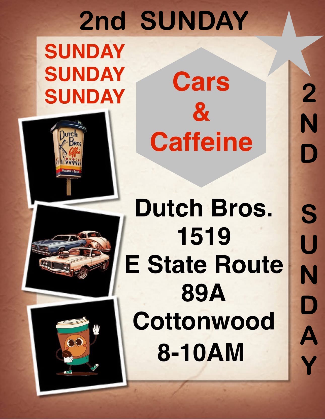 2nd Sunday Cottonwood, AZ. Cars & Caffeine Dutch Bros. 1519 E State Route 89A 8am - 10am Event Flyer